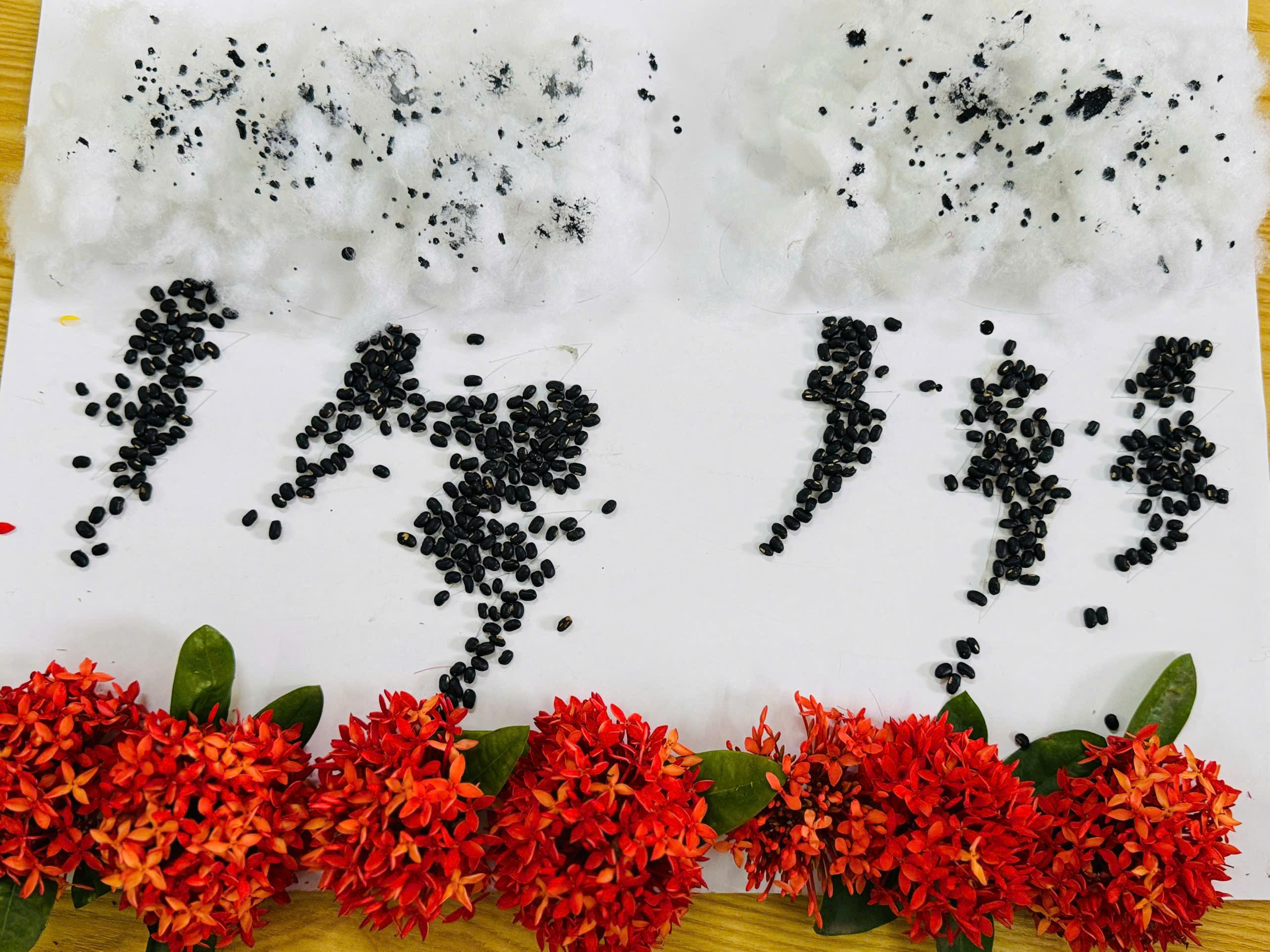 Sấm sét thường mang đến cảm giác uy nghiêm, nhưng qua bàn tay khéo léo và các nguyên liệu gần gũi, các con đã biến nó thành một tác phẩm đầy sắc màu. Hạt đỗ tượng trưng cho những tia lửa điện mạnh mẽ, bông trắng làm nên những đám mây nặng hạt, và hoa chính là vẻ đẹp của sức sống sau cơn mưa. Bức tranh giúp chúng ta thêm yêu và trân trọng những hiện tượng kỳ thú của thiên nhiên.