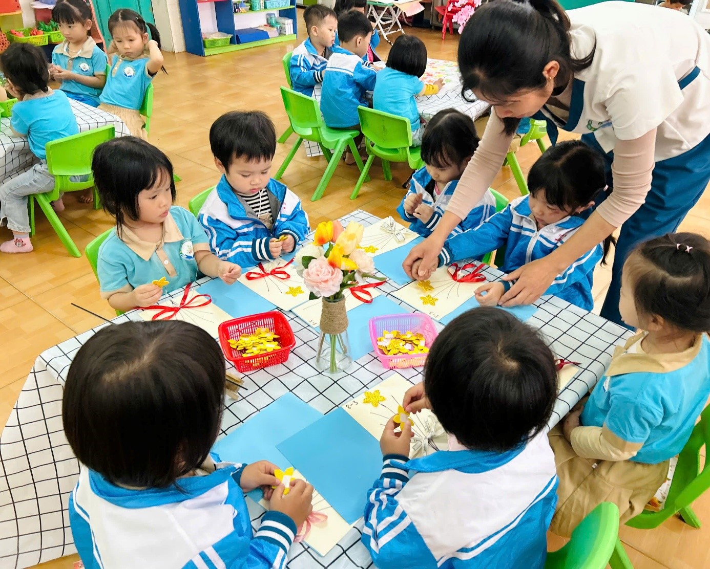 * “Bé làm thiệp tặng bà, tặng mẹ”: Trẻ tự tay trang trí những chiếc thiệp xinh xắn gửi gắm tình yêu thương.